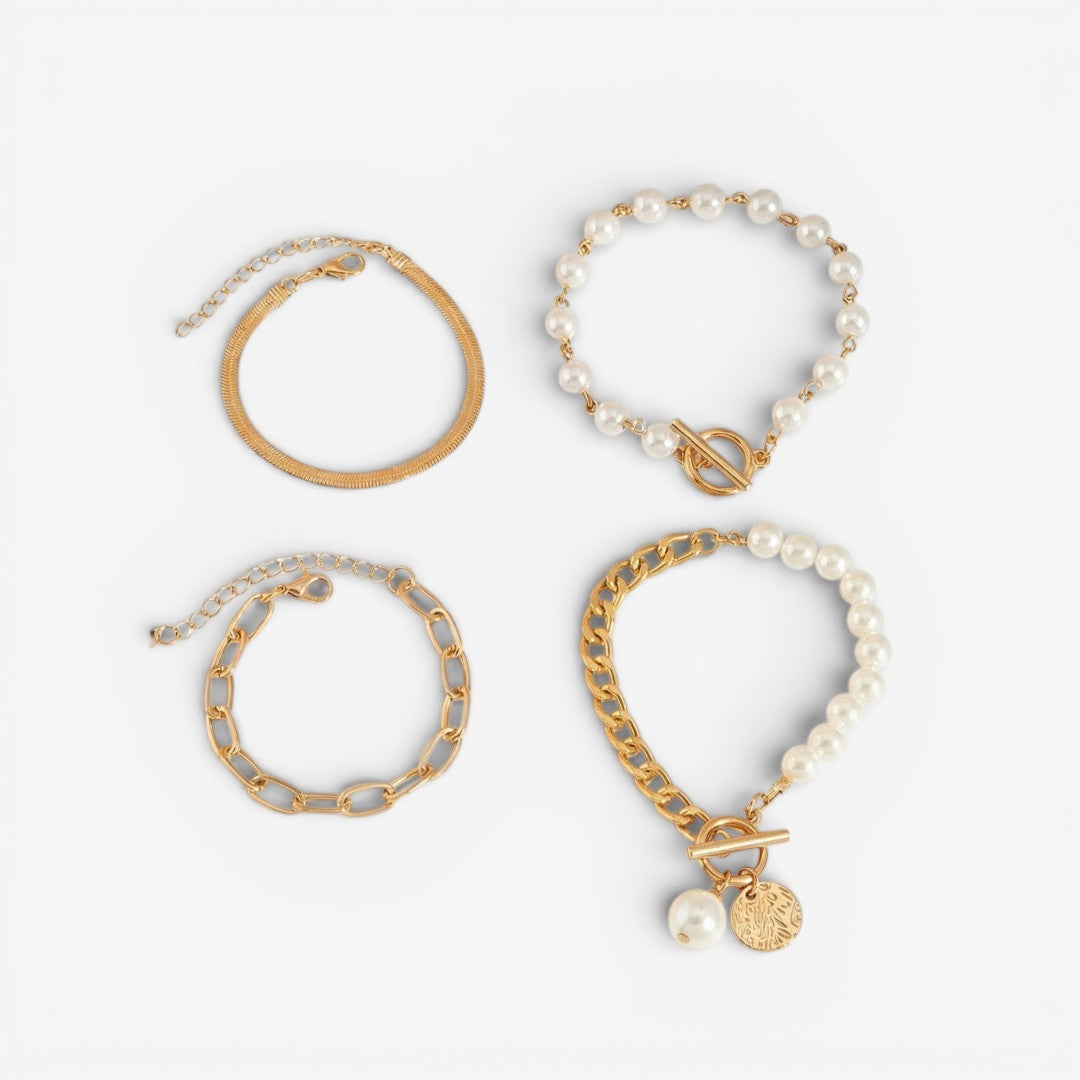 Elegáns, 4 részes arany karkötő szett – kígyó, gyöngyök és láncszemek