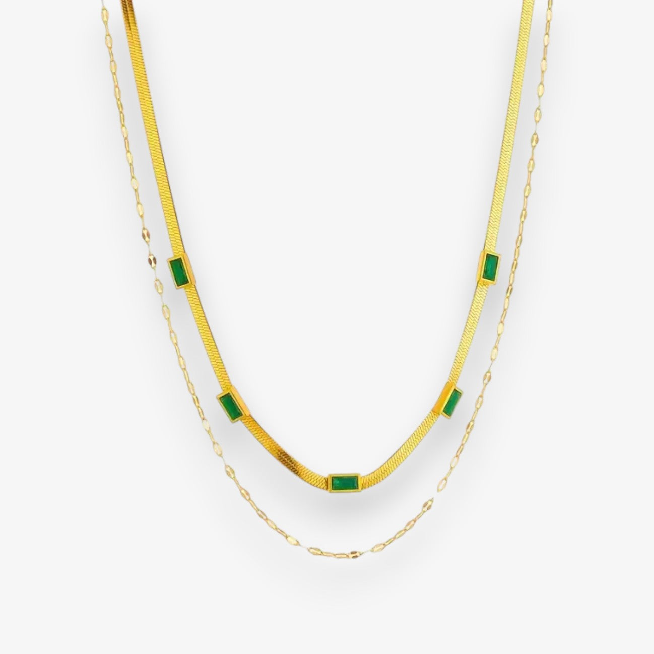 A Kornélia retró stílusú, kétsoros arany nyaklánc időtlen eleganciát és kifinomult karaktert sugároz. A két különböző hosszúságú lánc harmonikusan rétegződik, miközben a finoman elhelyezett zöld drágakő részletek friss kontrasztot és luxus érzetet adnak az összhatáshoz.